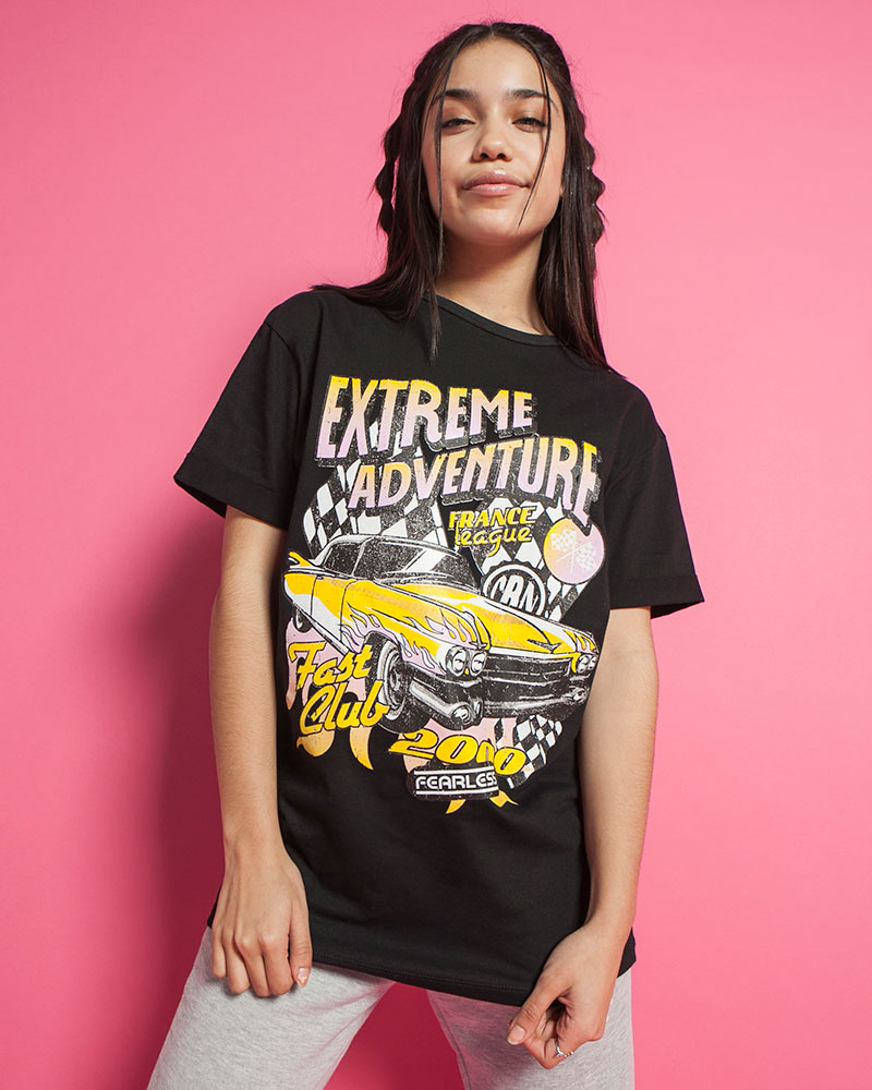 DescripciónRemera oversize, jersey algodón, estampa "Extreme Adventure", manga corta