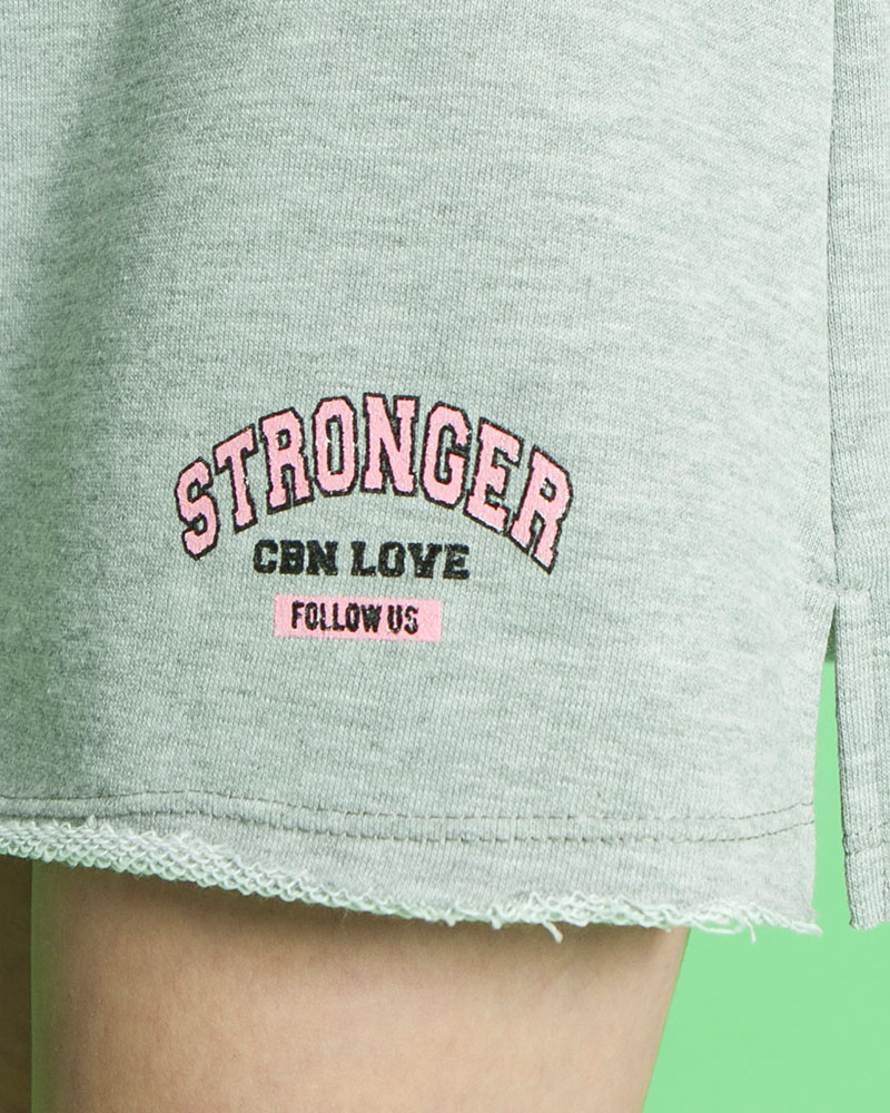 DescripciónFalda rústico soft, estampa "Stronger", con elástico y cordón en cintura, ruedo al corte con tajo laterales