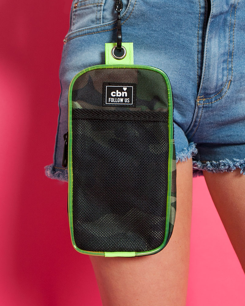 Portacelular nylon con bolsillo de red y mosquetón con cordón y tanca