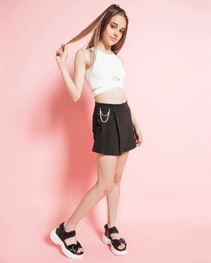 Short pollera Greta #7 Short pollera portafolio, bengalina, con tablas y cadena en presilla, con cierre en trasero Talles: 10 a 18 Colores:Negro